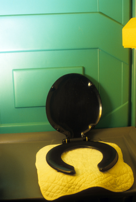 Privy is a collaborative installation by Chicago artists Laurel Fredrickson and Susan Peterson. The installation confronts the societal norms that proscribe, define, articulate, and isolate us both within and without the social body. Distanced from our physical bodies, our ordinary acts are degraded and separated from us. The membrane of convention defines our limits and names us as civilized beings, whose inner and outer experiences are clearly delineated. We inhabit the divided spheres of public and private. Precise rules of conduct carefully limit and deny the movement of activities from one sphere to the other, from outside to inside. Perceptions of the self alter as one moves from external to internal space, from what is open to what is protected. Paradoxically, the protection offered by the portable toilet is both one of cover and exposure, particularly in the act of transition, from inside to outside. This precarious privacy reflects the anxiety inherent in any delineation between self and society.