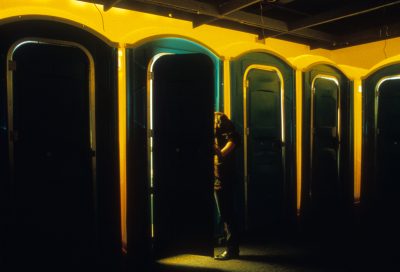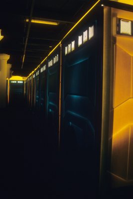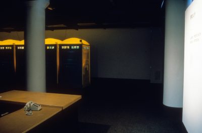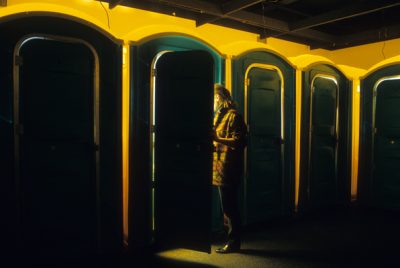 The installation is constructed of some thirty portable toilets viewed from two distinctly different positions: objective exterior and subjective interior, which includes “sub-installations” within approximately half of the units. In its denial of, or access to, the virtual interior of the installation, Privy suggests the decisions and the options available to the individual regarding inclusion, exclusion, or seclusion.