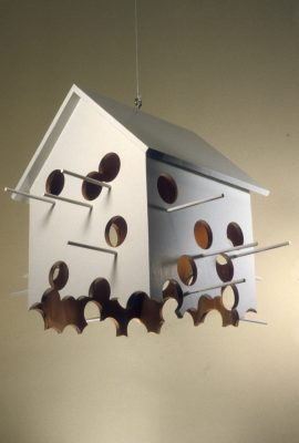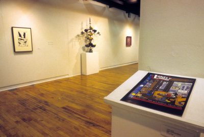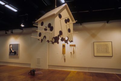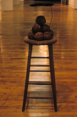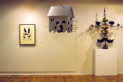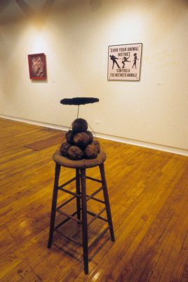 Some of the artists in Laughing Matters present work whose eccentric character puts an idiosyncratic slant on the otherwise familiar, as can be seen in M. W.Burns’ frantic multifamily birdhouse and Mike Lash’s drawing on found material. David Ireland’s sculpture made of wadded wallpaper sitting on a stool is given the black velvet sunshade, which in some parts of Africa signifies the presence of dignitaries. Chris Ware manipulates a traditional strip cartoon format, while Glen Baxter joins cartoon techniques to painting. Similarly, Joel Otterson’s Muscle Man Fruit Compote is meticulously crafted out of plumber’s copper tubing and handfuls of gew-gaws. And visual puns—with punch—are present in Andy Yoder’s Home Wrecker and Tony Mendoza’s Working Mother.