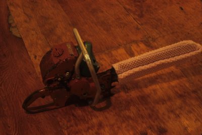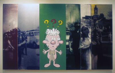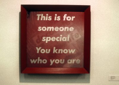 The language of advertising and forms from popular culture are the vehicle, and in some cases the issue, in the work of another group of artists. Ilona Granet, Barbara Kruger, and Erika Rothenberg all use the persuasive voice of anonymous authority to expose cultural misapprehensions. Granet’s jaunty street sign, Kruger’s double-edged photograph, and Rothenberg’s lead balloon greeting cards insert a feminist voice into mainstream media. Raymond Pettibon reduces philosophy to the banal cry of a swooning cartoon figure, while Klindt Houlberg’s folk art genitalia are pressed into service as His ‘n Hers items.