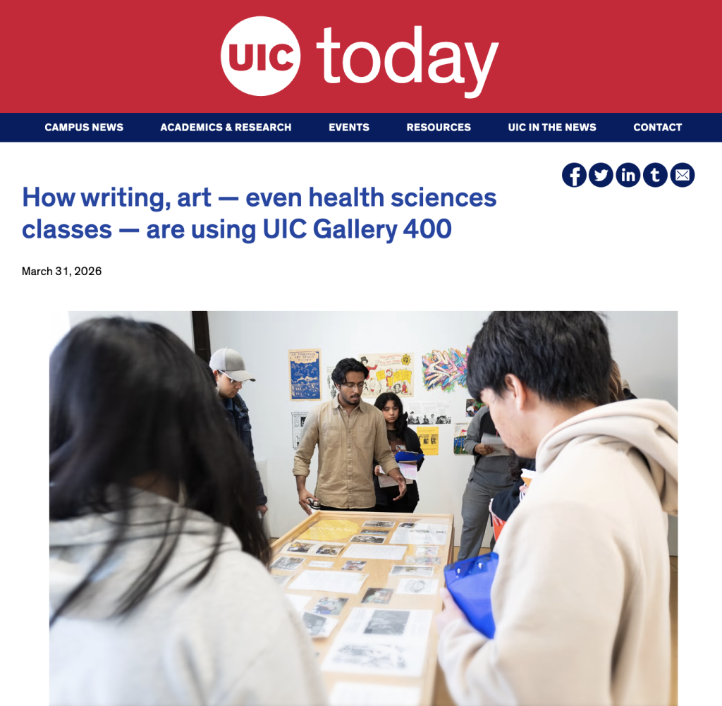 Many thanks to UIC Today for highlighting how UIC classes engage UIC Gallery 400 and its exhibitions. Check out the article here to read about the many ways UIC students learn in the Gallery on exhibition tours, workshops, or assignments.