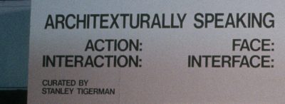 Architexturally Speaking, curated by Stanley Tigerman, director of UIC ’s School of Architecture, provides an opportunity for Gallery 400 to showcase the work of ten UIC faculty members who create their works at the crossroads of architecture and language. The contributors include three assistant professors, six adjunct faculty, and one visiting critic; four women and six men; three who build now, five who might build later, and two who may never build; three PhDs, six Ivy League pedigrees; two who edit, six who write; and none from Chicago. Despite their disparate backgrounds, however, all ten are obsessed with the conjunction between writing and architecture, all are committed teachers, all create work paradigmatic for students, all are near the top of his or her multivalent game(s). Collectively they represent the trajectory that UIC’s School of Architecture has taken. They were “the best of breed” of a new day dawning on architecture/architexture. In Architexturally Speaking, they are called upon to interact/interlace/intersect one with the other, and the other, and the other.