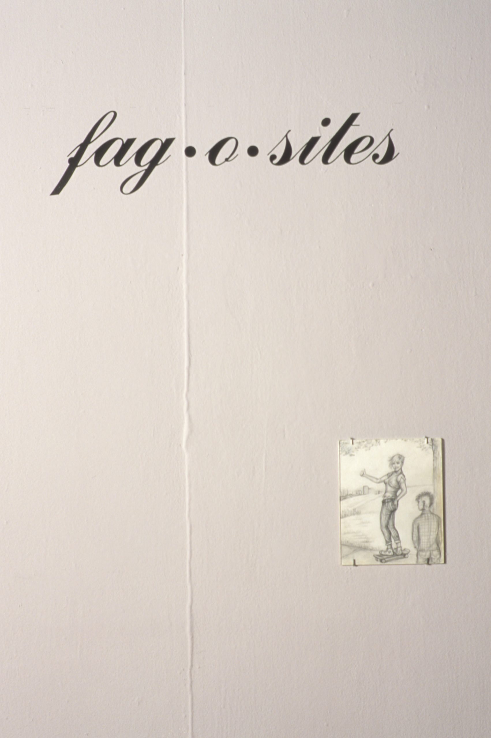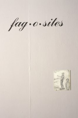 The hyphenated and neologistic title of this exhibition, in its resonance with the term phagocyte, references a lexicon of AIDS discourse, micropolitics of desire, and the consumption or destruction of discrete units. It thereby begins to cite counter-strategies of queer cultural practice, and the multiplicity of spaces, geographies, and architectures that they fabricate, disrupt, re-invent, and appropriate as fag-o-sites. These discrete units may be understood as spaces created by strictly identity-based and often ghettoizing practices. Fag-o-sites, on the other hand, are non-ghettoizing, de-domesticating, survival fabrications of queer everyday life, through which spaces are temporarily claimed and dislocated for purposes of queer resistance and future survival. Through deterritorializing logics, fag-o-sites are fabricated and dispersed across a queer geopolitics and thereby constitute some of the critical sites and escape-routes of queer movement today.