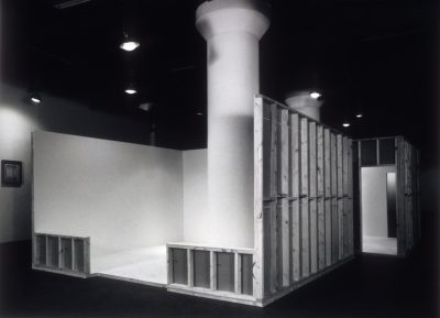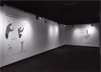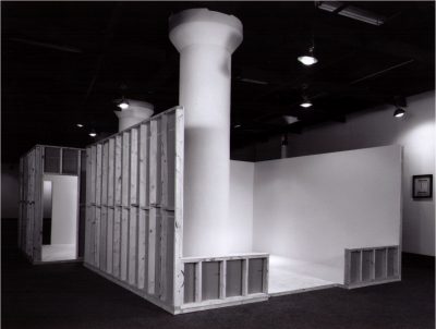 The installation & how too is a critical analysis of an art gallery as a neutral white room. Using Gallery 400 as a backdrop, artist Mike Hill and architect Scott Kester, as the Art Builders Collaborative (ABC), explore the relationship between the production of artwork and the creation of physical space in which art is exhibited. Within the Gallery 400 space, ABC will build a three-quarters scale version of Robbin Lockett Gallery using standard building materials and methods, thus essentially re-creating a commercial space in an exhibition context. Displayed as art object, the gallery reveals its particular idiom of design and construction, exposing and exaggerating its stillness by uncovering the inherent art/architecture relationship that lies within it. Murals illustrating the step-by-step process of building the gallery are painted on Gallery 400’s walls; the murals will be documented by a professional art photographer before they are painted over. ABC’s exhibition includes the photo-documents of the instructions before they were painted over—adding to the layers of art shows past. Simultaneously, the exhibition space is demystified through the exposure of its physical creation, and it is revealed as an important record of exhibition history—of the physical absence of artworks. As shows come and go, the walls remain superficially the same: spackled, repainted, ready for the next.