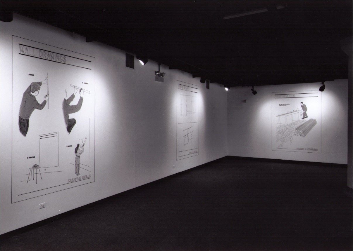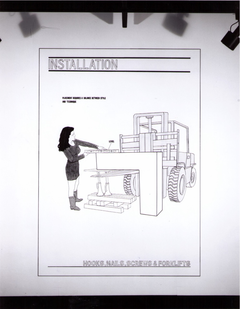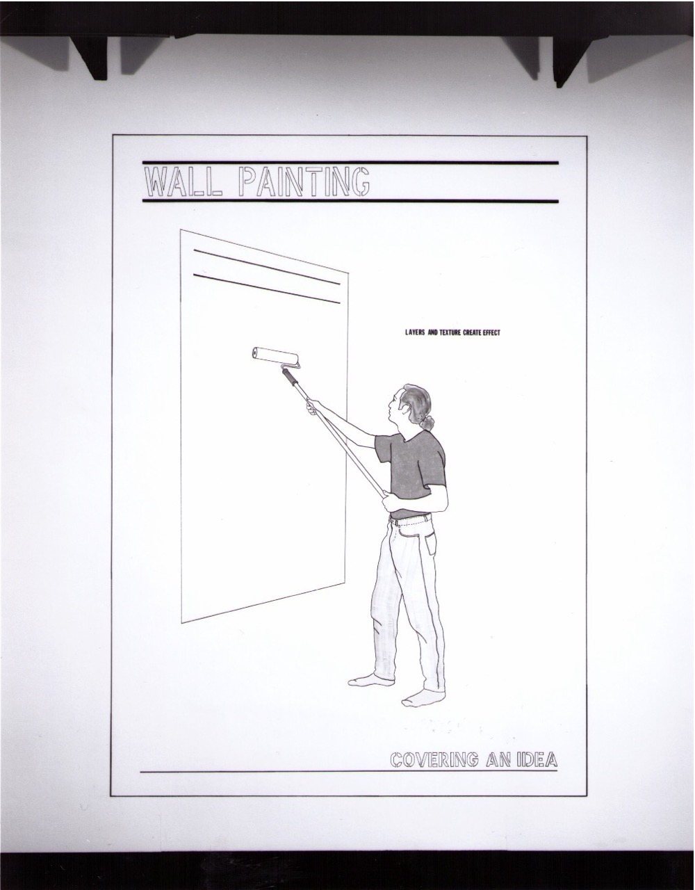 The installation & how too is a critical analysis of an art gallery as a neutral white room. Using Gallery 400 as a backdrop, artist Mike Hill and architect Scott Kester, as the Art Builders Collaborative (ABC), explore the relationship between the production of artwork and the creation of physical space in which art is exhibited. Within the Gallery 400 space, ABC will build a three-quarters scale version of Robbin Lockett Gallery using standard building materials and methods, thus essentially re-creating a commercial space in an exhibition context. Displayed as art object, the gallery reveals its particular idiom of design and construction, exposing and exaggerating its stillness by uncovering the inherent art/architecture relationship that lies within it. Murals illustrating the step-by-step process of building the gallery are painted on Gallery 400’s walls; the murals will be documented by a professional art photographer before they are painted over. ABC’s exhibition includes the photo-documents of the instructions before they were painted over—adding to the layers of art shows past. Simultaneously, the exhibition space is demystified through the exposure of its physical creation, and it is revealed as an important record of exhibition history—of the physical absence of artworks. As shows come and go, the walls remain superficially the same: spackled, repainted, ready for the next.