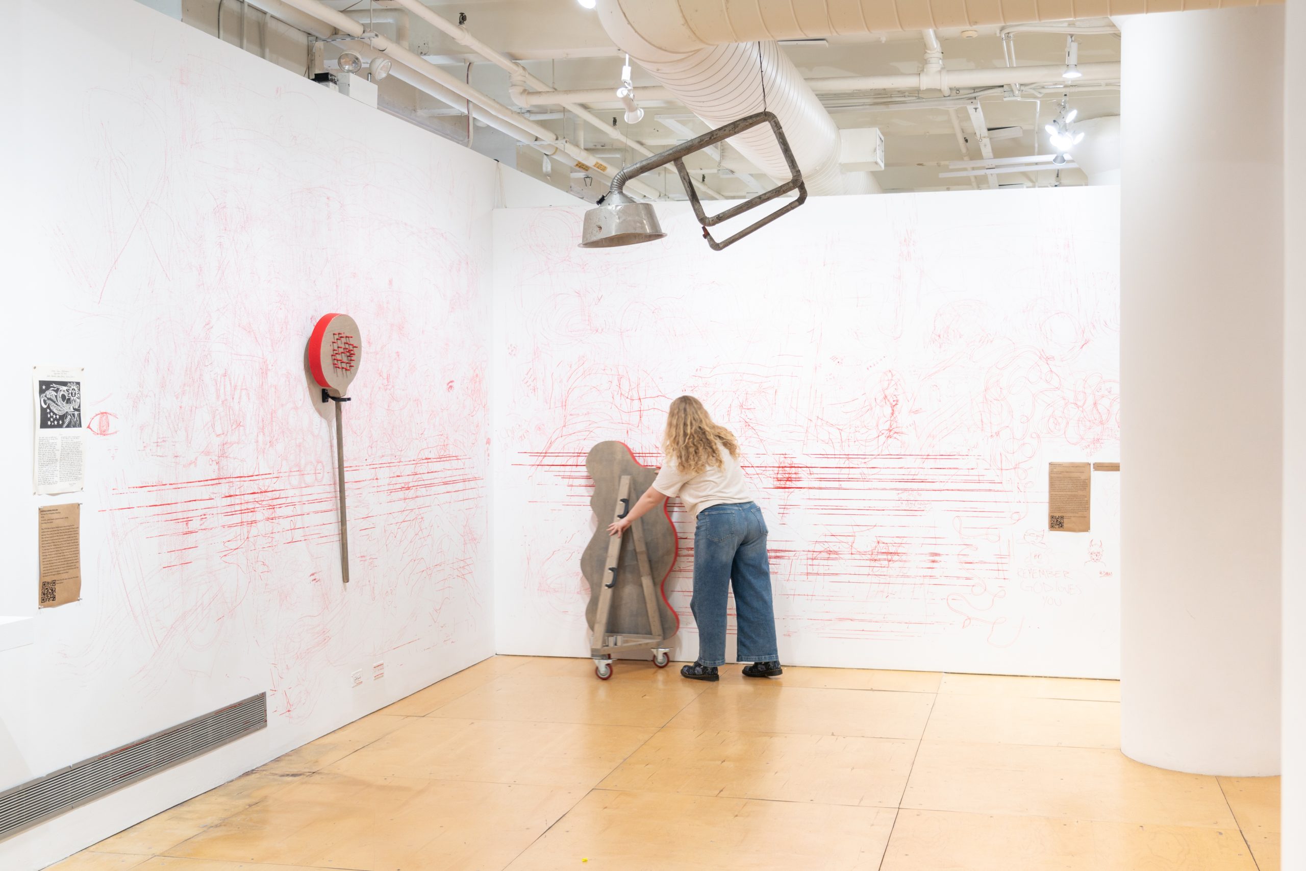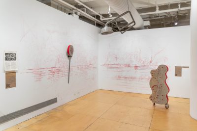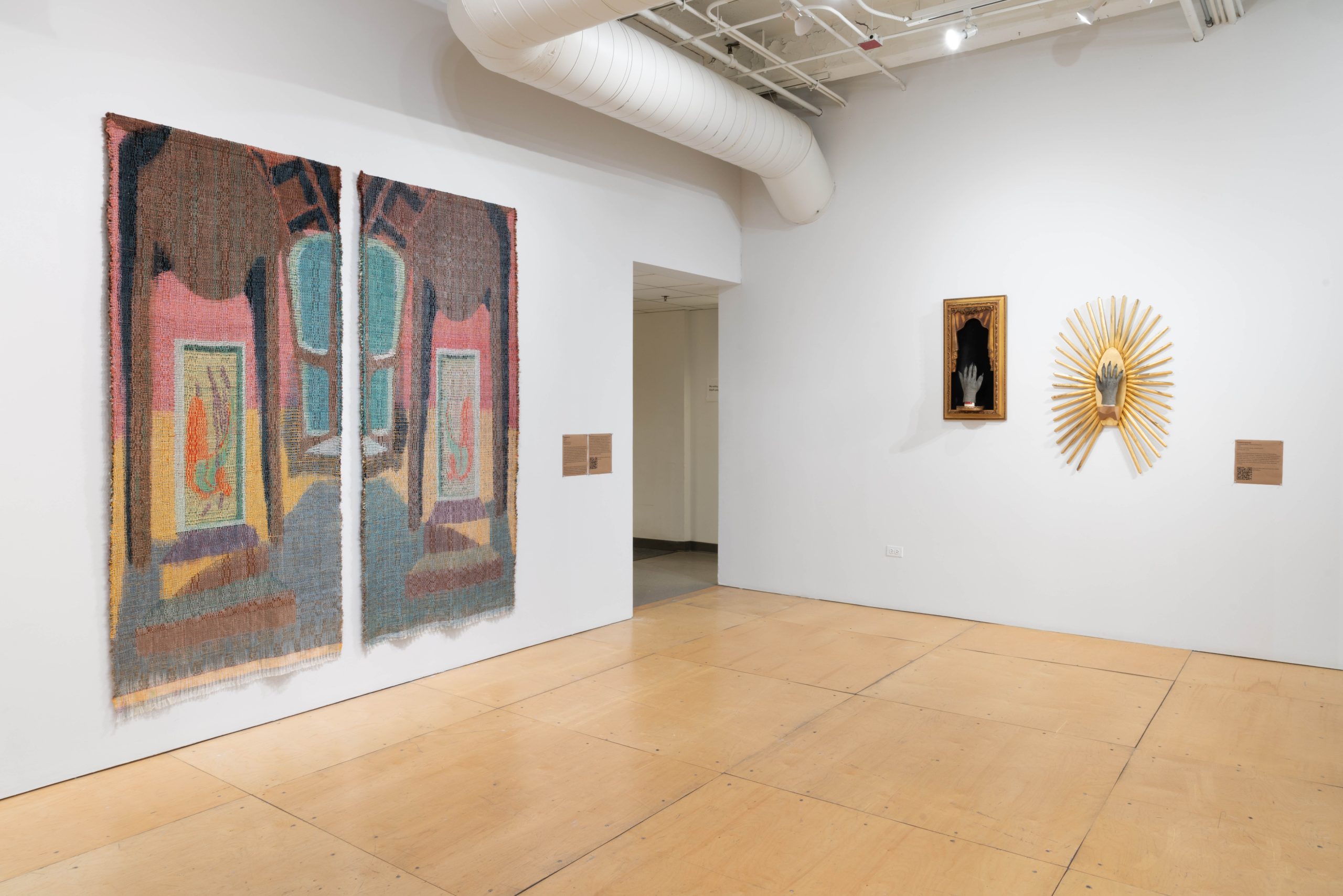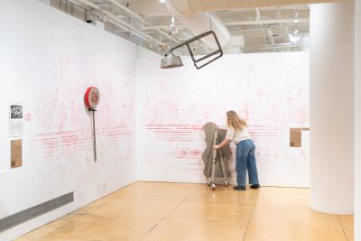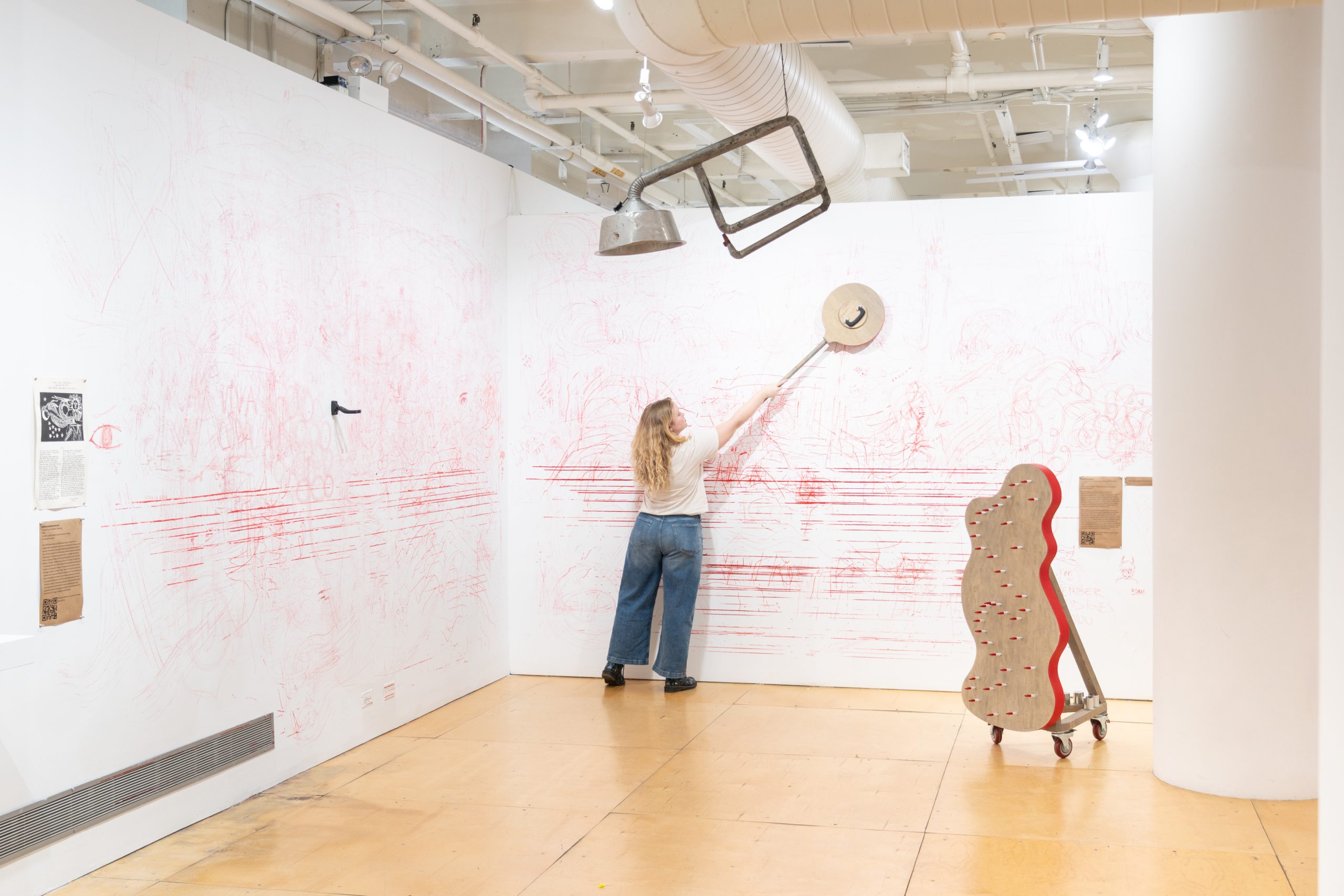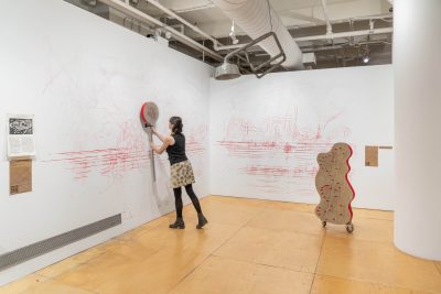 Maria Gaspar, a former collaborating teacher of Pros Arts, presents a work that reflects on her mother’s participation in the collective as a clown and the collective’s influence within her teaching and artistic practice. She says, “One of the most memorable experiences was learning how Pros Arts engaged with clowning. It revived an interest in clowning for me because I recalled that Pros Arts and my mom used clowning similarly—as a social practice.” A student of Pros Arts when in elementary school, filmmaker Alan Medina is making an experimental short film, One Grand Spot, that documents the memories and materials housed in the 100-year-old Pilsen building that holds Pros Arts’ archive. Jiashun Zhou’s large-scale tapestry offers a virtual view of one of the building’s entrances. Alberto Aguilar partners with three of his students to create a short film that utilizes props and costumes from the archive. Victoria Martinez’s painting references backdrops created by students of Galileo Scholastic Academy during drama workshops conducted by Pros Arts in 1997. Mauricio López F. reveres the unrestrained creativity and imagination fostered during childhood by creating a drawing instrument that enables visitors to draw expressively, as a child would, on the gallery’s walls.