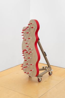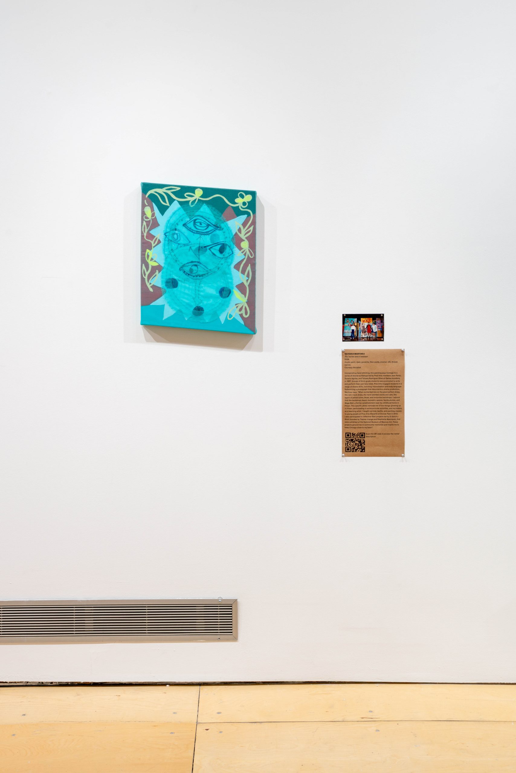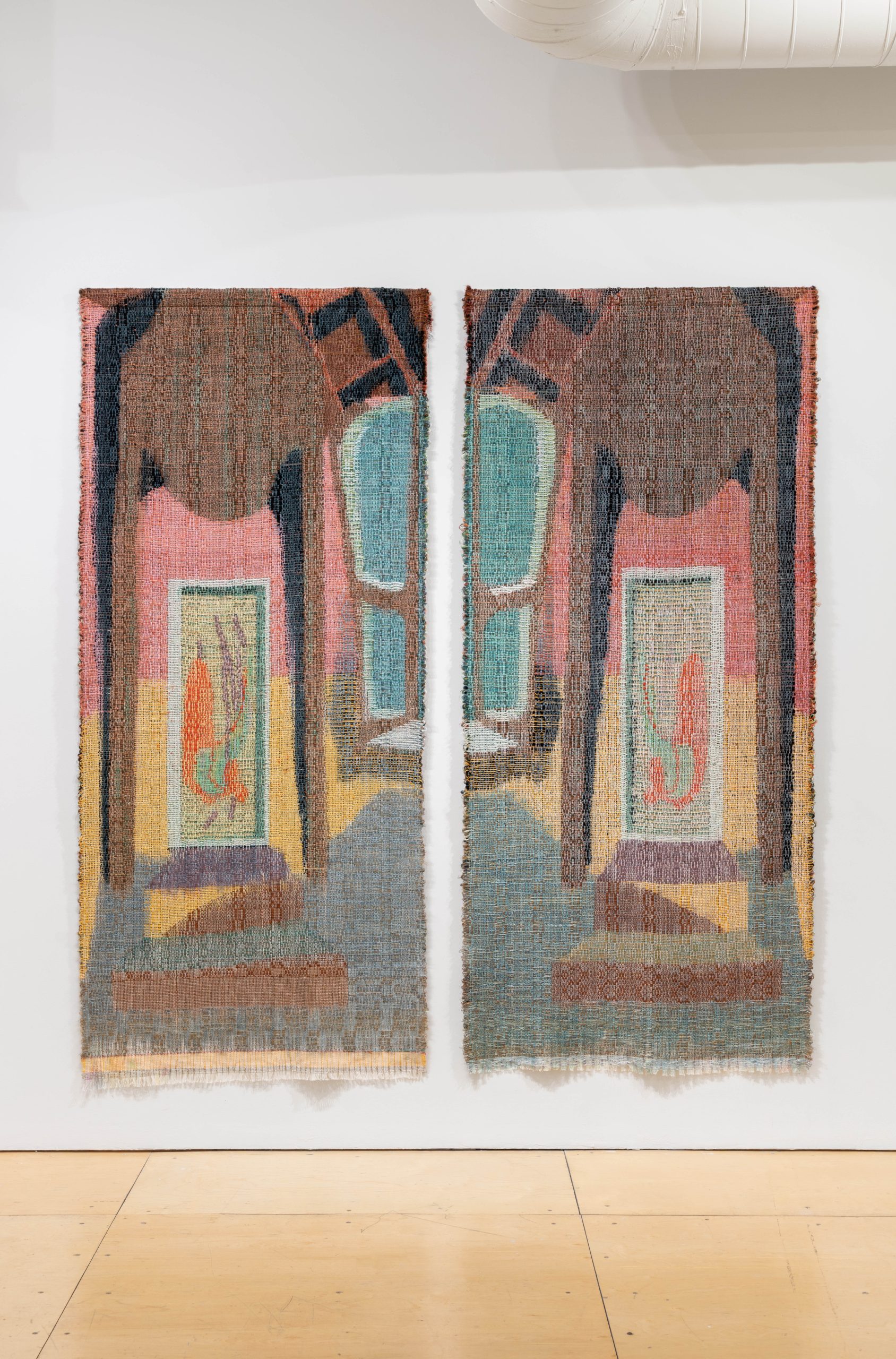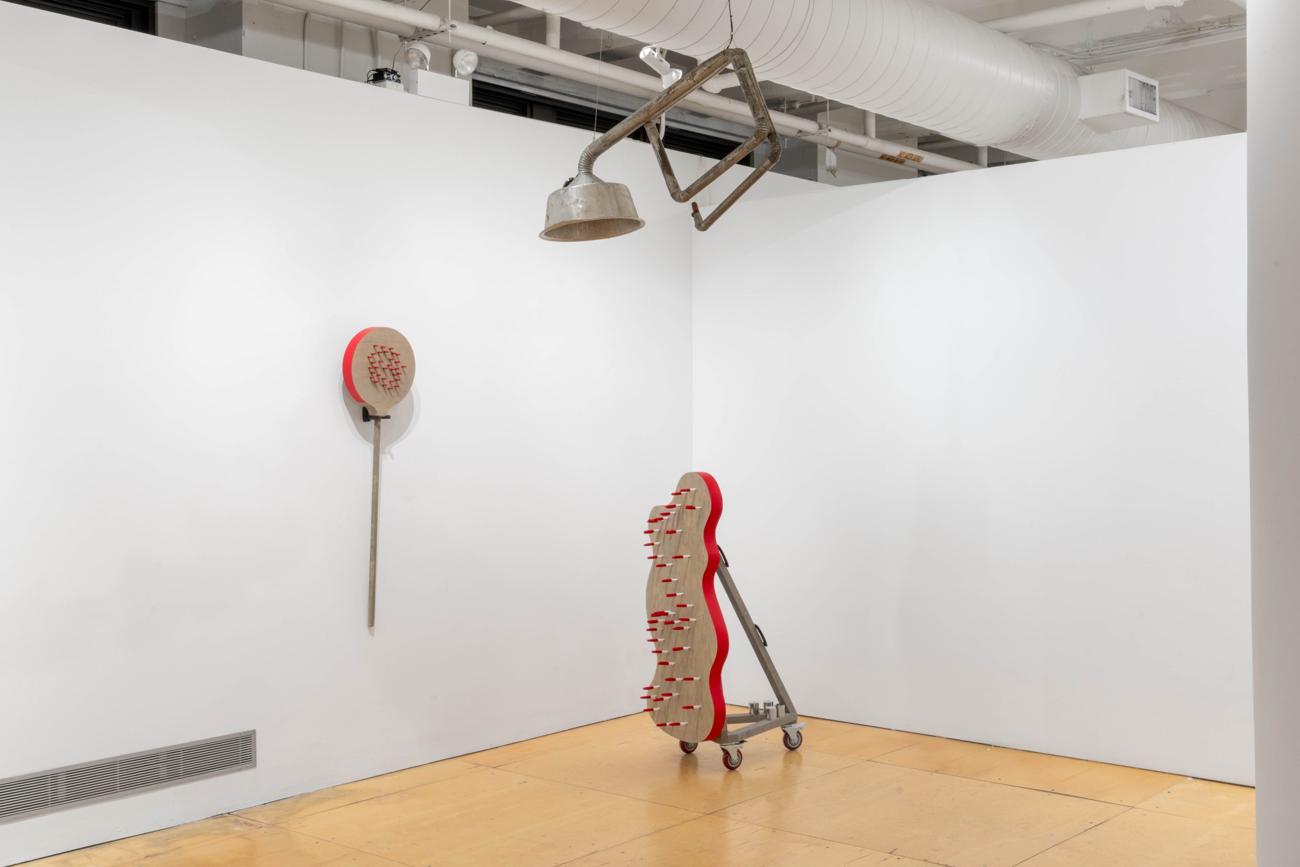 Maria Gaspar, a former collaborating teacher of Pros Arts, presents a work that reflects on her mother’s participation in the collective as a clown and the collective’s influence within her teaching and artistic practice. She says, “One of the most memorable experiences was learning how Pros Arts engaged with clowning. It revived an interest in clowning for me because I recalled that Pros Arts and my mom used clowning similarly—as a social practice.” A student of Pros Arts when in elementary school, filmmaker Alan Medina is making an experimental short film, One Grand Spot, that documents the memories and materials housed in the 100-year-old Pilsen building that holds Pros Arts’ archive. Jiashun Zhou’s large-scale tapestry offers a virtual view of one of the building’s entrances. Alberto Aguilar partners with three of his students to create a short film that utilizes props and costumes from the archive. Victoria Martinez’s painting references backdrops created by students of Galileo Scholastic Academy during drama workshops conducted by Pros Arts in 1997. Mauricio López F. reveres the unrestrained creativity and imagination fostered during childhood by creating a drawing instrument that enables visitors to draw expressively, as a child would, on the gallery’s walls.