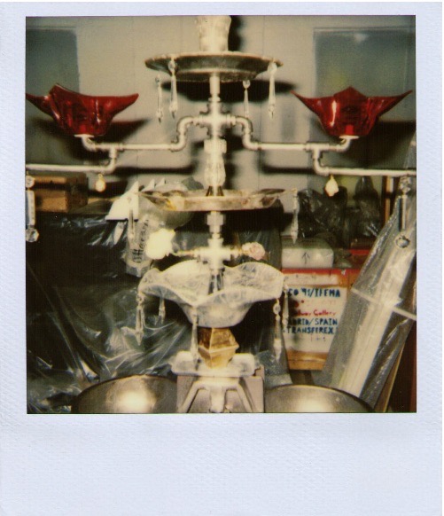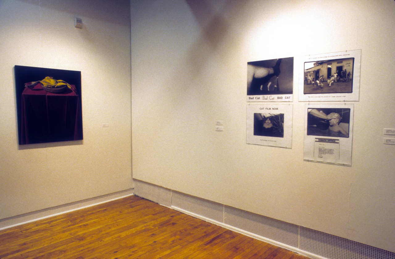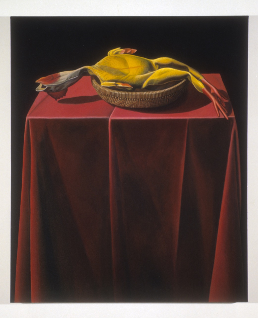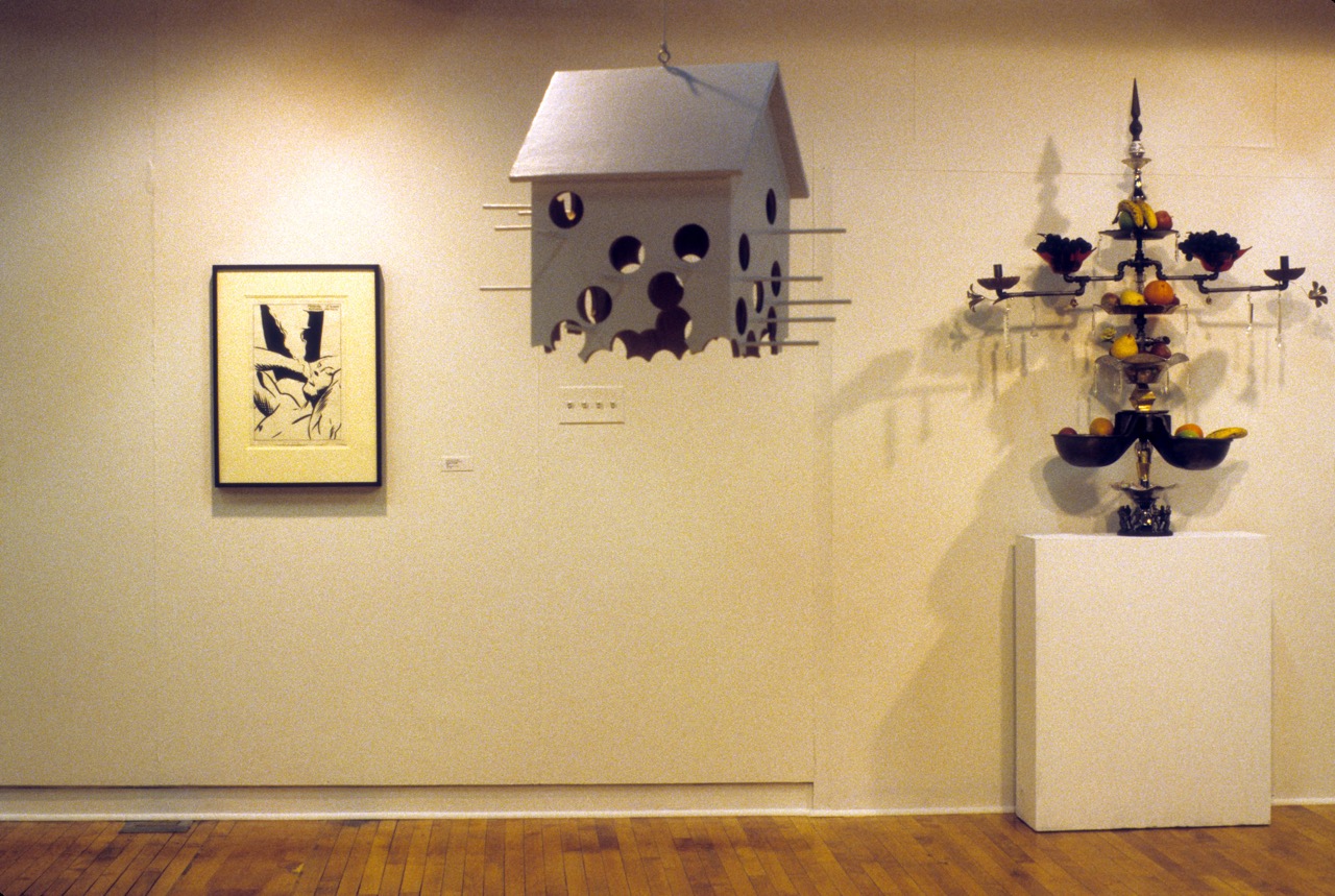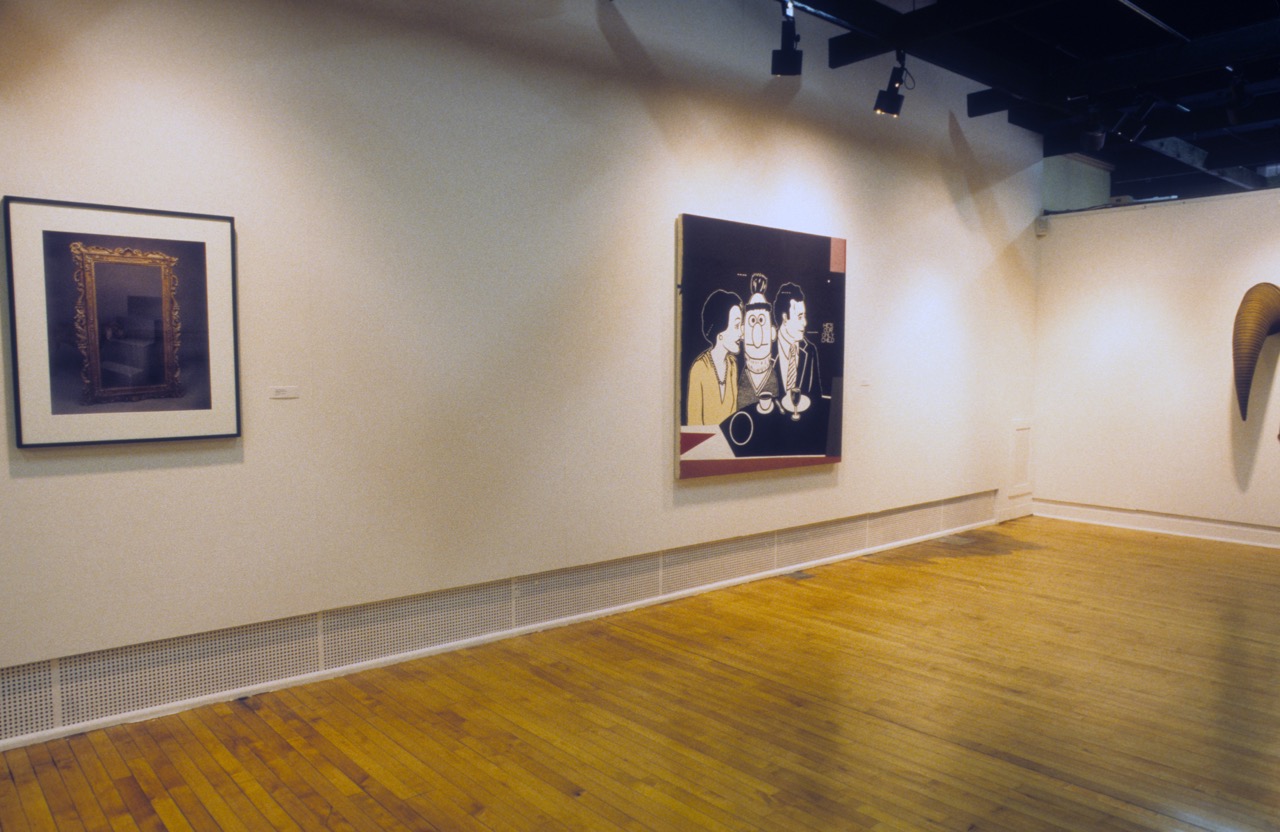 For painters Julie Wachtel, Steven Gianakos, John Wesley, and Nancy Hild, disjunction of form serves as the latent content of paintings in which an initial dopey cartoon appeal masks a quiet provocation. Wachtel’s dizzy Disney gnome is coupled with photographic images of riot police and a religious procession, producing a discomfort akin to that of the TV viewer jerked from news to commercial. As with Gianakos’ startled puppet staring blankly from between his spruce, confident (surely adoptive?) parents, Wachtel raises questions of identification, both of painter and viewer, and the demise of the heroic subject. John Wesley’s Bumstead Homeless presents the familiar middle-class family man, still smartly dressed, snoring by a lamp-post, while Nancy Hild, maintaining the posture of trompe-l’oeil painting, chooses a rubber chicken as still-life subject. The divergent axes spun by the artists in this exhibit include the collision of “high-art painting” with popular culture, the clashing of sign and meaning, and a weird and effective mixture of materials.
