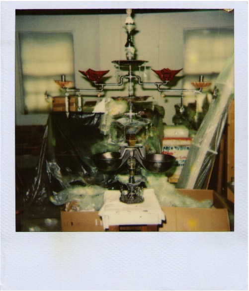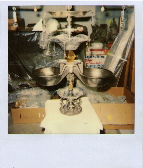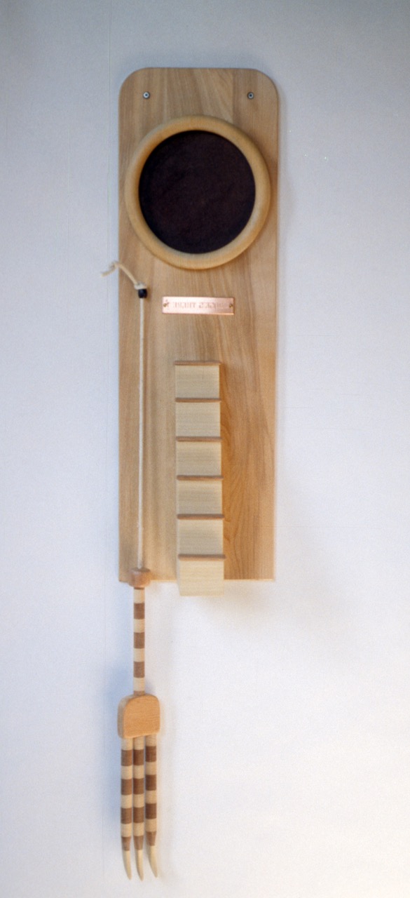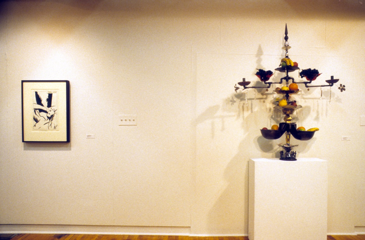 Some of the artists in Laughing Matters present work whose eccentric character puts an idiosyncratic slant on the otherwise familiar, as can be seen in M. W.Burns’ frantic multifamily birdhouse and Mike Lash’s drawing on found material. David Ireland’s sculpture made of wadded wallpaper sitting on a stool is given the black velvet sunshade, which in some parts of Africa signifies the presence of dignitaries. Chris Ware manipulates a traditional strip cartoon format, while Glen Baxter joins cartoon techniques to painting. Similarly, Joel Otterson’s Muscle Man Fruit Compote is meticulously crafted out of plumber’s copper tubing and handfuls of gew-gaws. And visual puns—with punch—are present in Andy Yoder’s Home Wrecker and Tony Mendoza’s Working Mother.