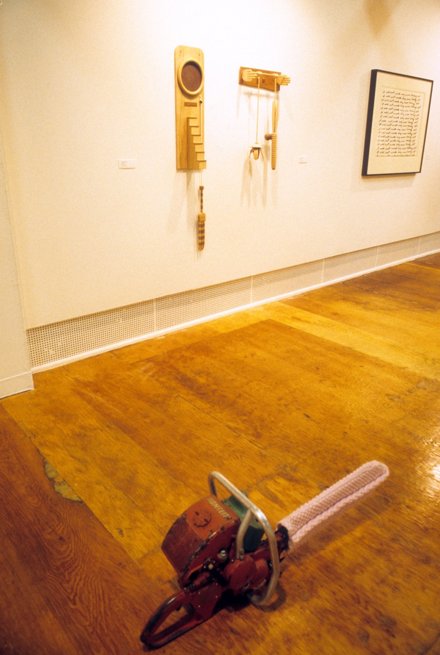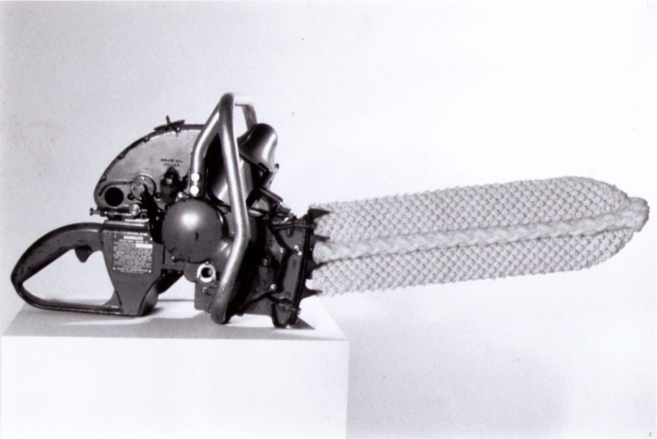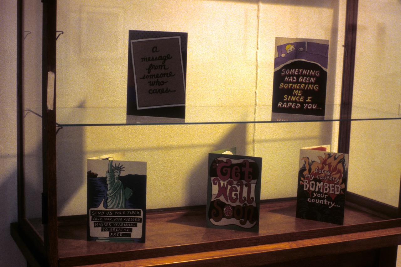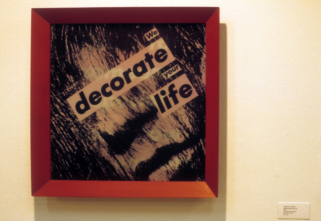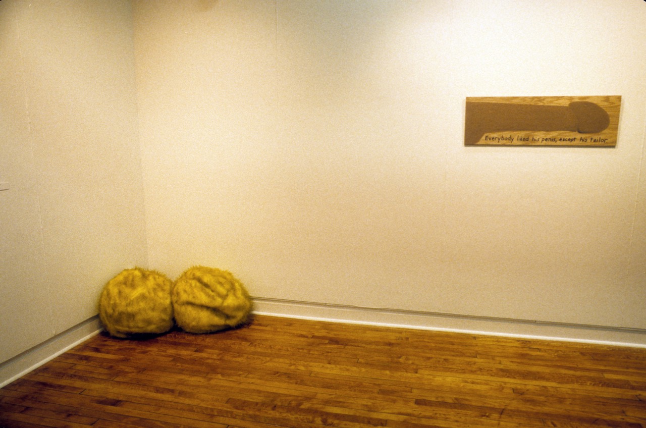 The language of advertising and forms from popular culture are the vehicle, and in some cases the issue, in the work of another group of artists. Ilona Granet, Barbara Kruger, and Erika Rothenberg all use the persuasive voice of anonymous authority to expose cultural misapprehensions. Granet’s jaunty street sign, Kruger’s double-edged photograph, and Rothenberg’s lead balloon greeting cards insert a feminist voice into mainstream media. Raymond Pettibon reduces philosophy to the banal cry of a swooning cartoon figure, while Klindt Houlberg’s folk art genitalia are pressed into service as His ‘n Hers items.