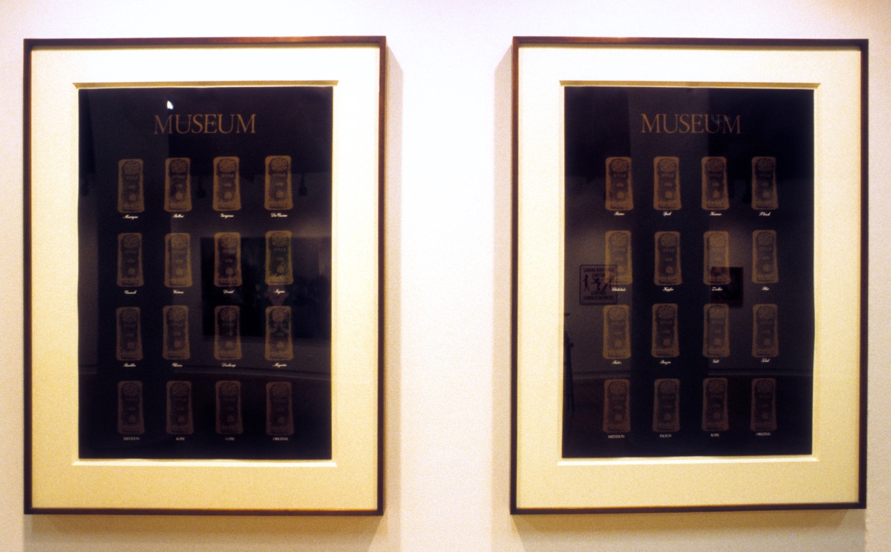 Art, or the artworld, is the subject of work by John Baldessari, Marcel Broodthaers, and William Wegman. Baldessari’s archetypically conceptual piece from 1971 was initially inscribed on gallery walls by students at the Nova Scotia College of Art and Design according to the artist’s telephoned instructions. Broodthaer’s history of art addresses issues of commodification while Wegman’s dog, Faye Ray, moves into position for her museum portrait.