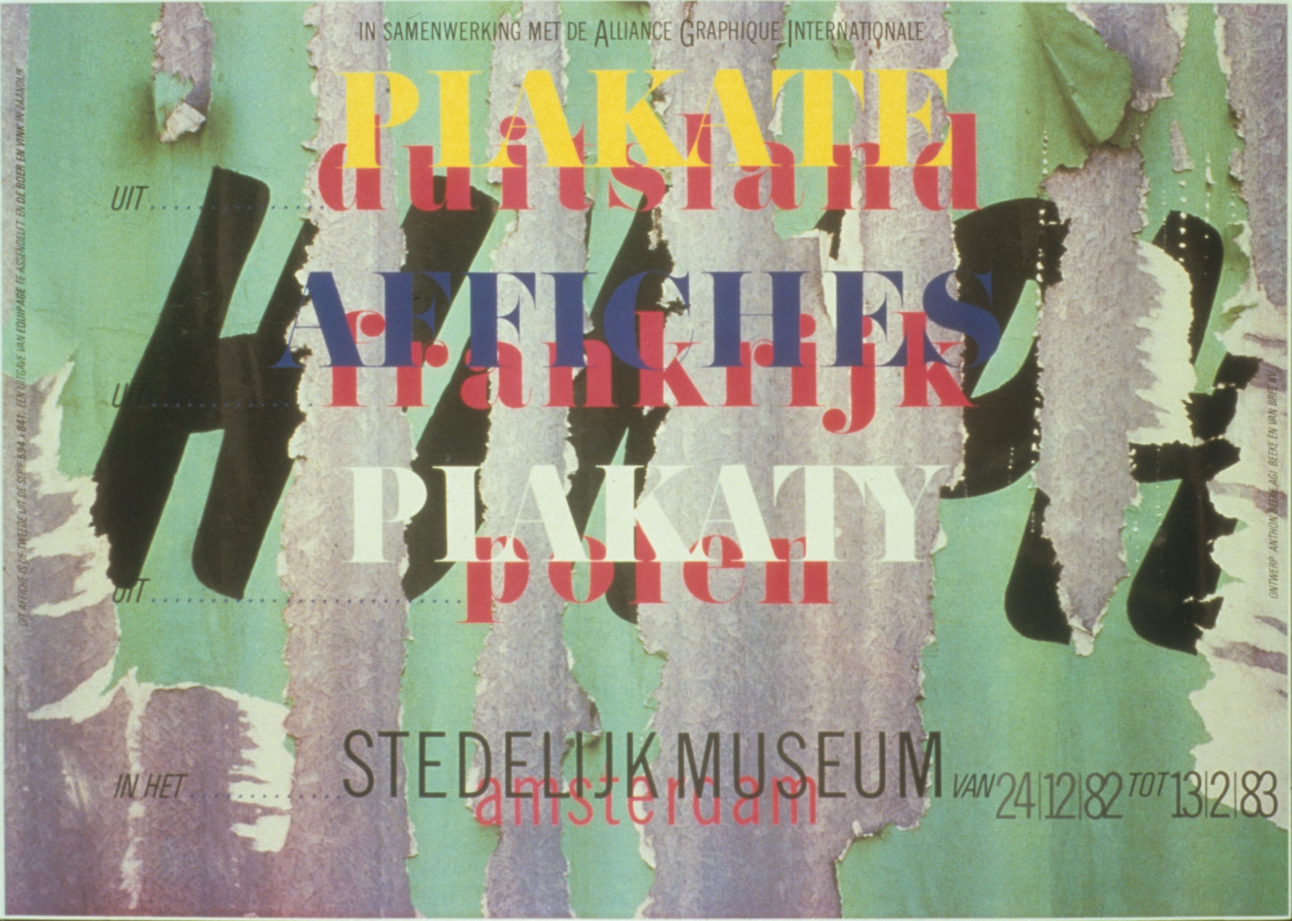 Dutch graphic designers, tougher and more socially conscious than their American New Wave counterparts, became trendsetters on the European and American art scene. This exhibition, featuring posters, stationery, catalogs, postage stamps, calendars, record jackets, magazines, brochures, and other printed items, documented the range and imaginative vitality of Dutch design. The exhibition mapped out the two poles of Dutch design in the mid-1980s: the rational, minimalist tendencies of Total Design, on the one hand, and the more radical, image-oriented work of Hard Werken, a Rotterdam studio, on the other. Posters to Postage Stamps also documented the taste-making role in the Netherlands of cultural institutions and the Dutch postal service (PTT): the “look” of museum catalogs, postage stamps, and banknotes was adopted by the private industry for advertising campaigns and corporate publications.