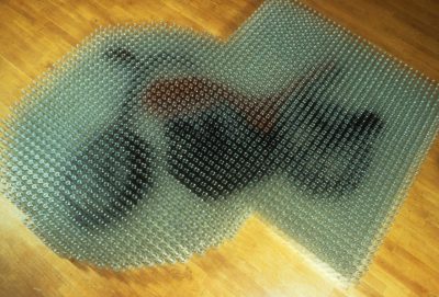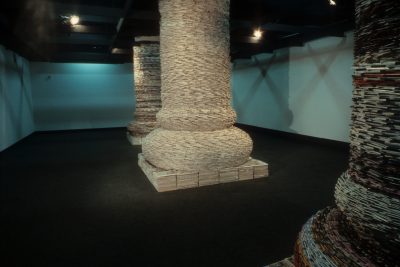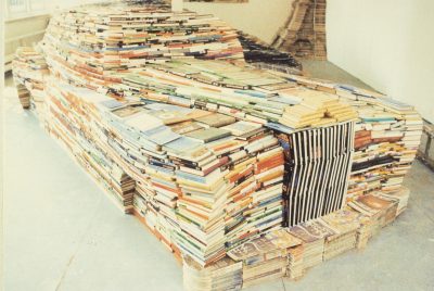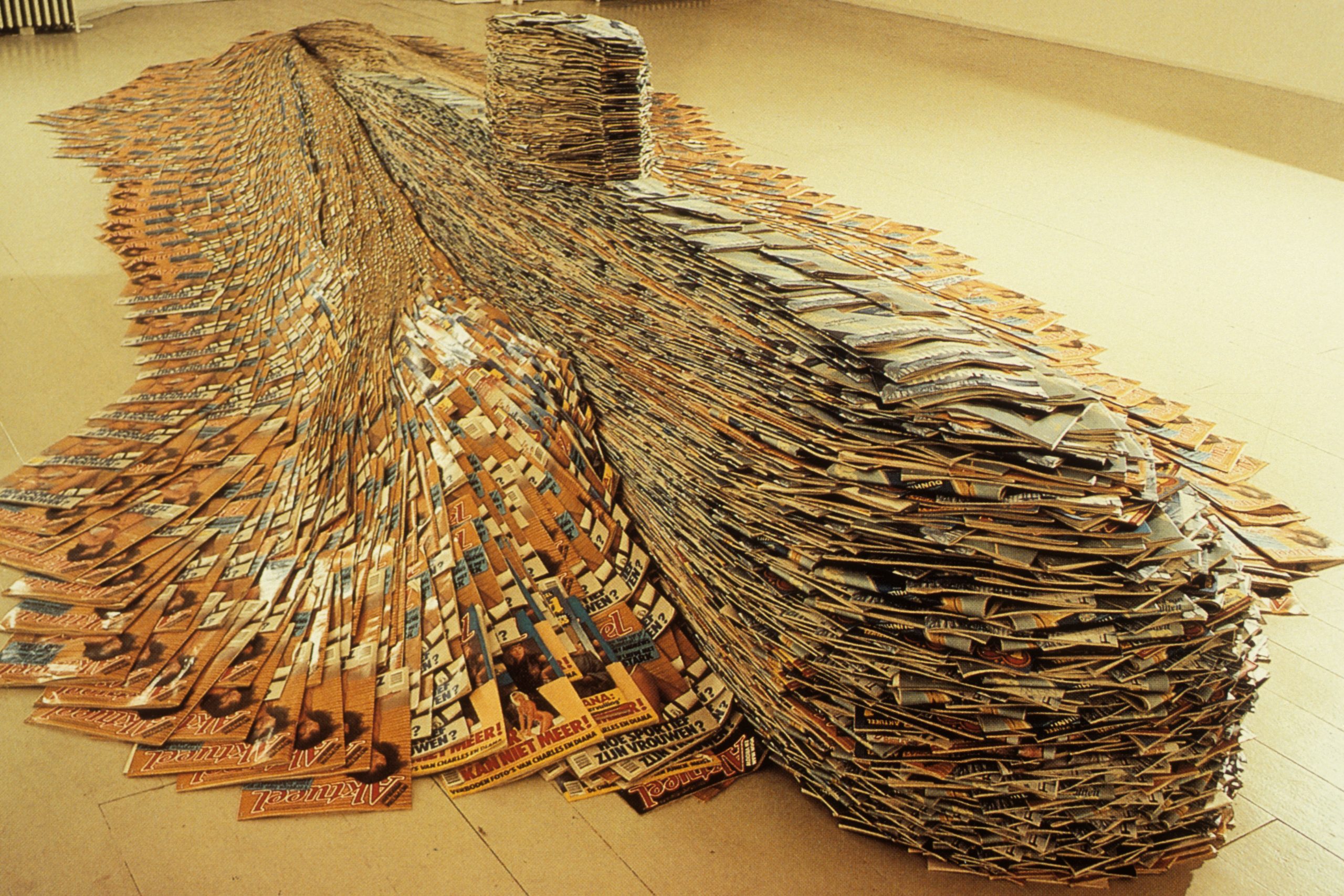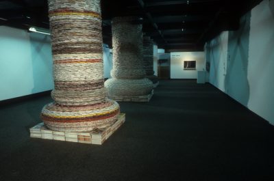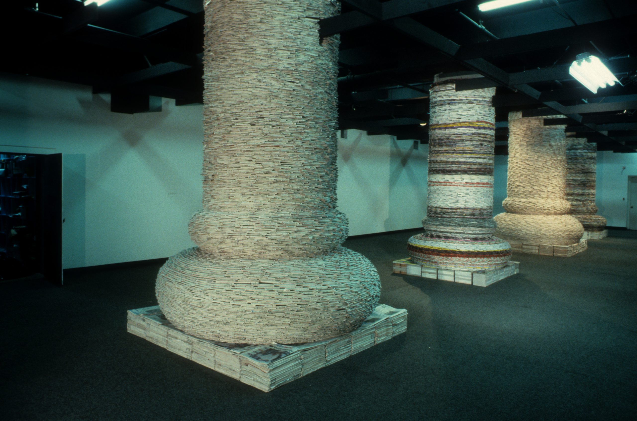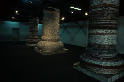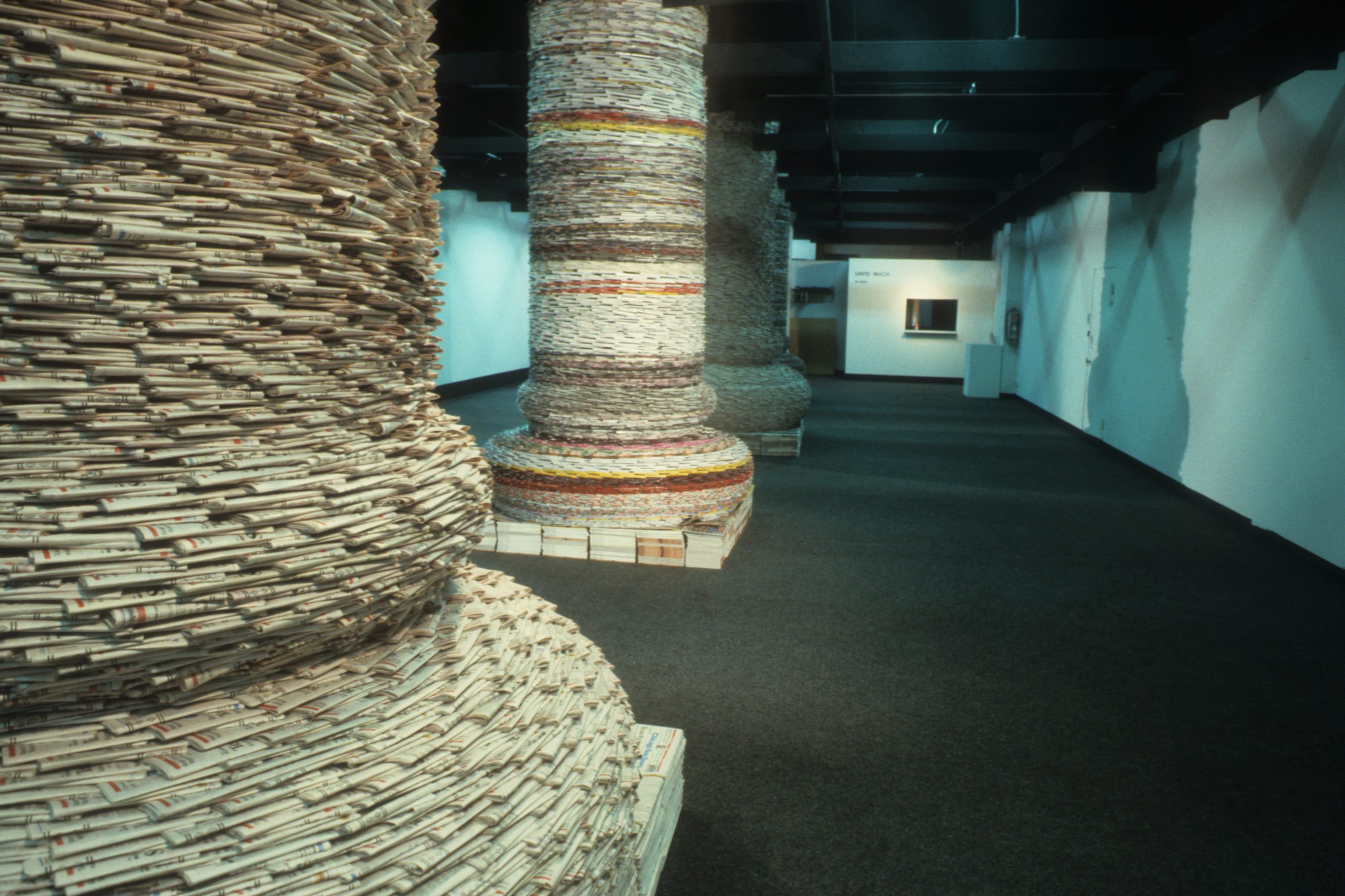 The work produced at Gallery 400 is predominantly formed of magazines and newspapers loaned by a local circulating company and daily newspaper. The process of creating the piece involved not only the employees at the company and the gallery but also negotiations with seven magazine distributors and the volunteer participation of the general public and student body to help assemble the actual work. Upon completion of the project, the sixteen tons of magazines and newspaper were returned, re-accounted for, and recycled by one of the three companies in the country that performs the difficult, costly, and timely job of recycling magazines by stripping both the clay coating and the color from each page.