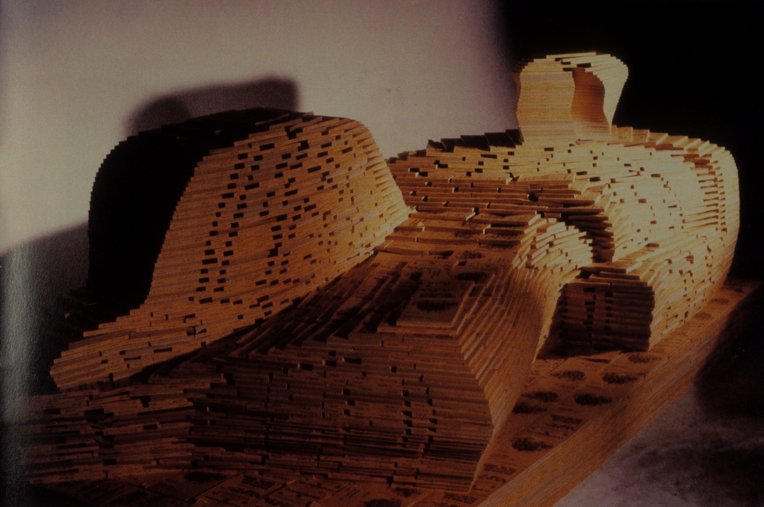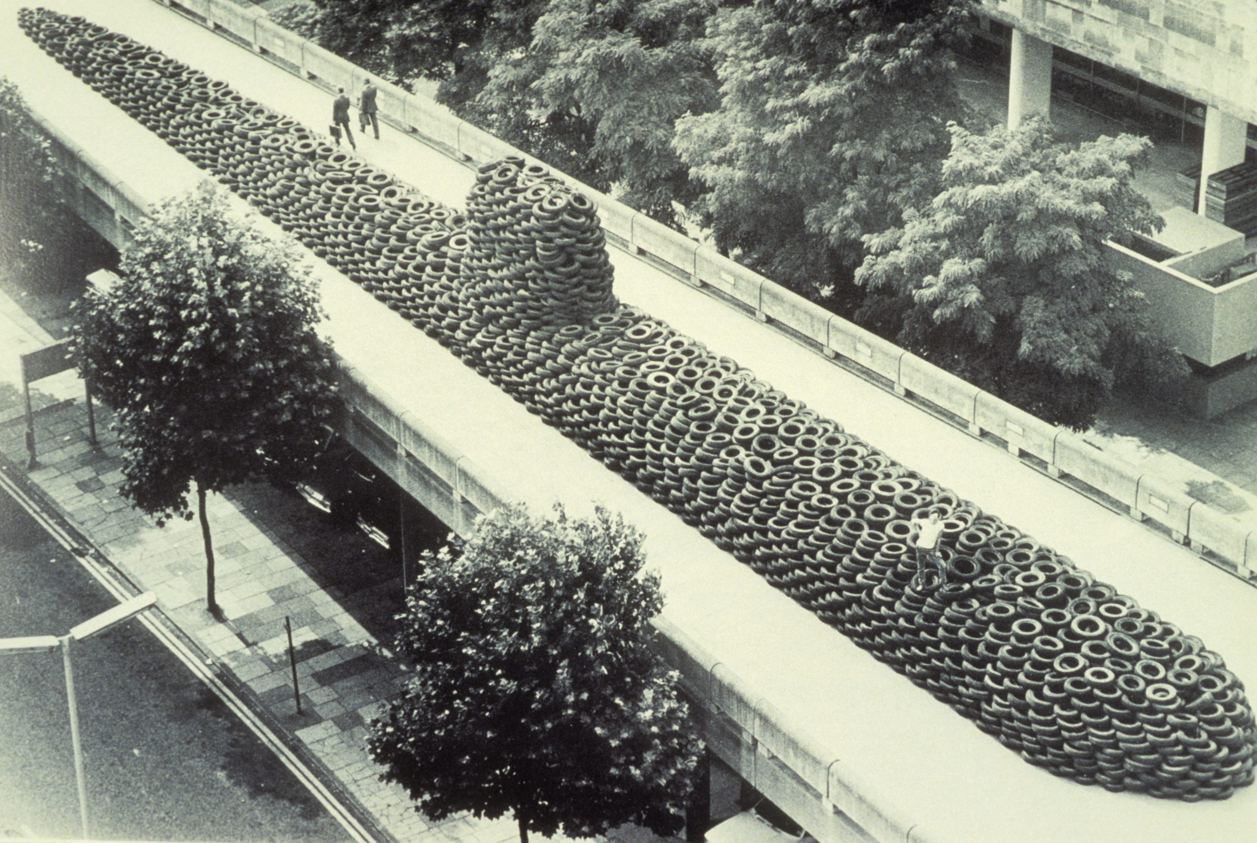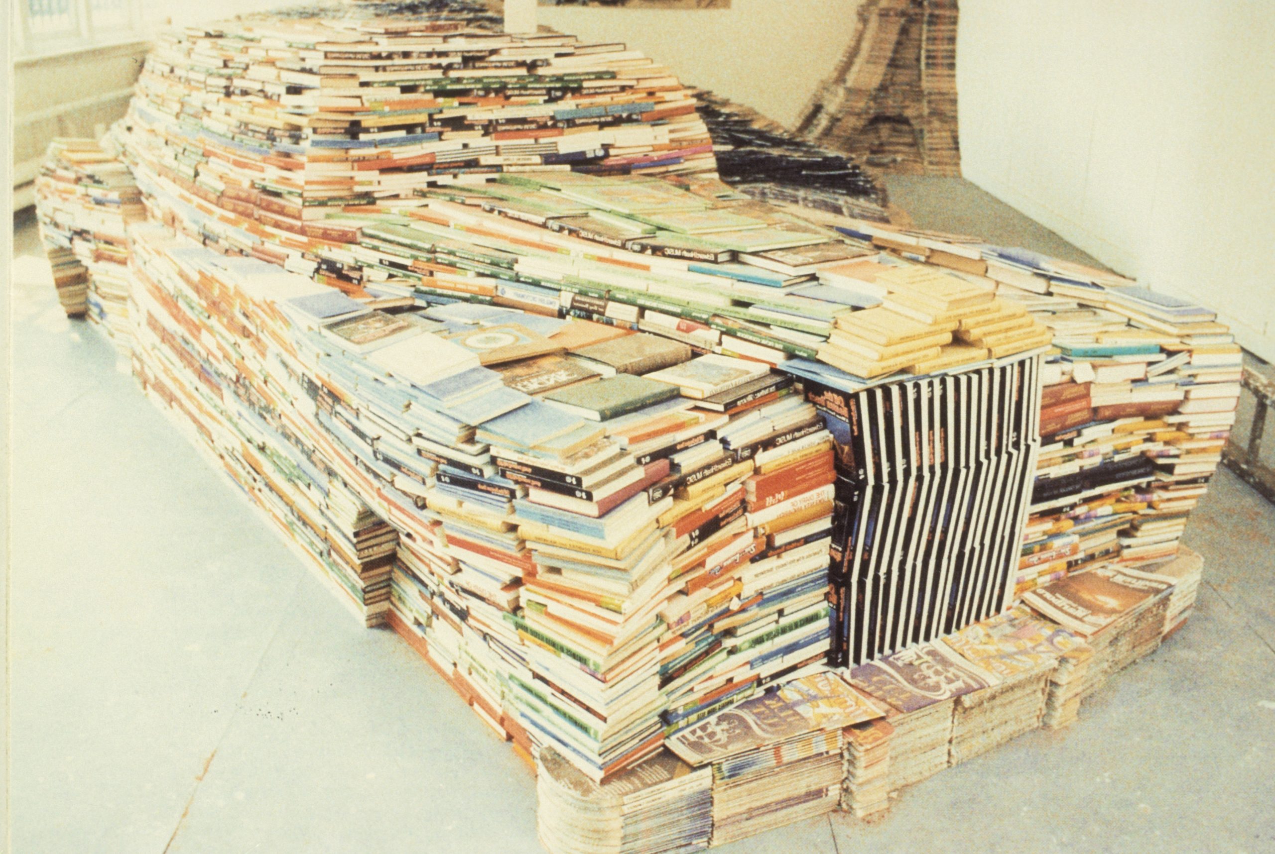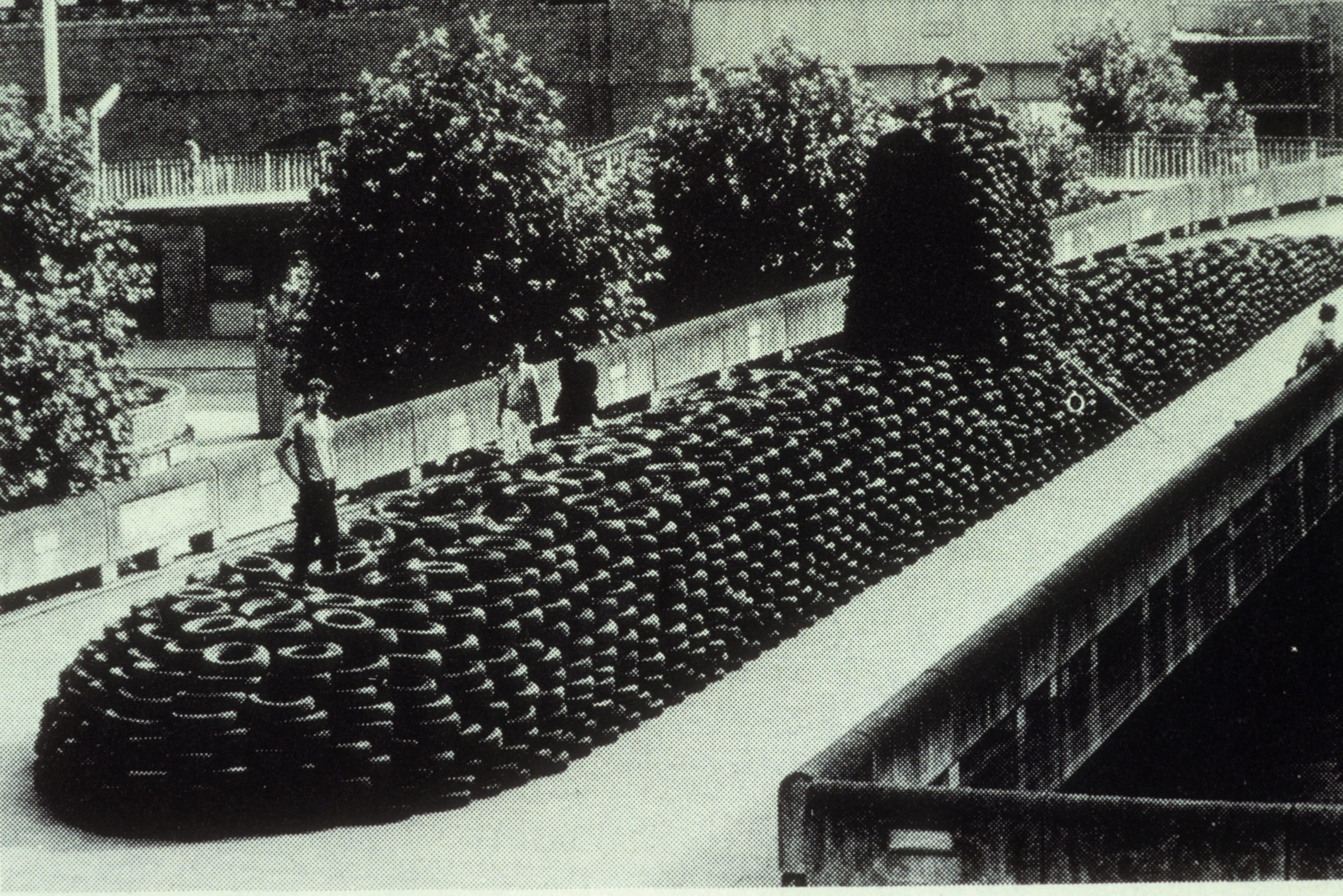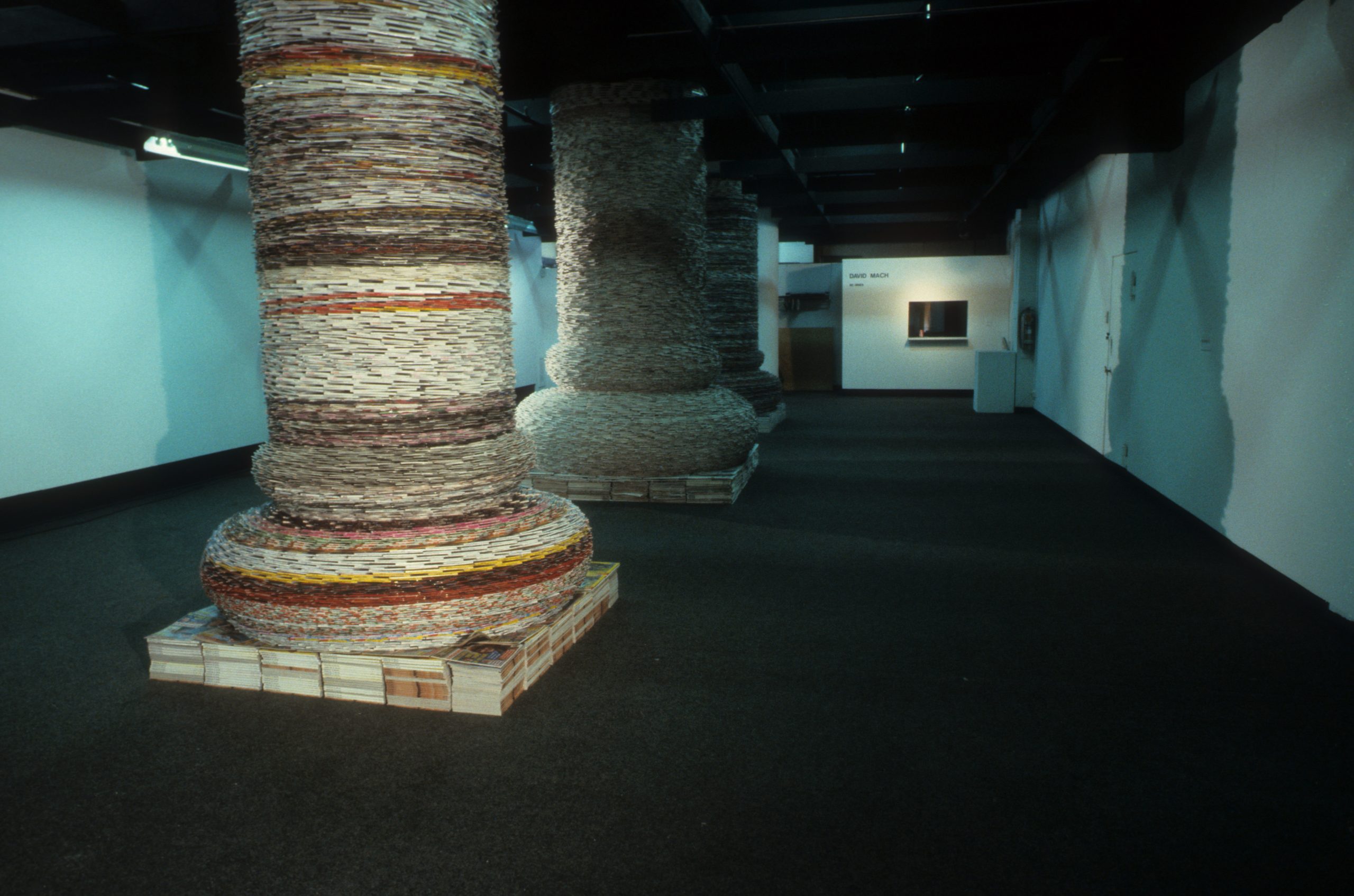 The installations/sculptures are constructed on location from materials of special interest to Mach, such as tires, magazines, furniture, and bottles. Large quantities of these surplus materials are made available to the artist from a variety of sources. Interested in relating his experiences to the population-at-large, he chooses everyday objects, mass-produced by industry, transforming them into other recognizable images through simple methods of stacking and layering.