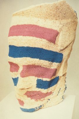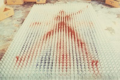 In the early 1980s, Mach began to produce some smaller-scale works assembled out of unstruck matchsticks. These mostly took the form of human or animalistic heads and masks, with the colored tips of the match heads arranged to construct the patterned surface of the face. After accidentally setting fire to one of these heads, Mach now often ignites his match pieces as a form of performance art. A second strand to Mach’s work are his collage pieces. Partly as a result of having access to thousands of reproduced images in the magazines left over from many of his installations, Mach began to experiment with producing collages. So far, this has culminated in National Portrait, a 10-by-23 foot collage for the Millennium Dome that featured many images of British people at work and at play.