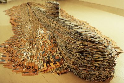 David Mach (born 1956) is a Scottish sculptor and installation artist. Mach’s artistic style is based on flowing assemblages of mass-produced found art objects. Typically these include magazines, teddy bears, newspapers, car tires, matchsticks, and coat hangers. Many of his installations are temporary and constructed in public spaces. One example of his early magazine pieces, Adding Fuel to the Fire, was assembled from an old truck and several cars surrounded and subsumed by about one hundred tons of magazines, individually arranged to create the impression that the vehicles were being caught in an explosion of flames and billowing smoke.